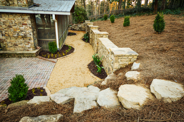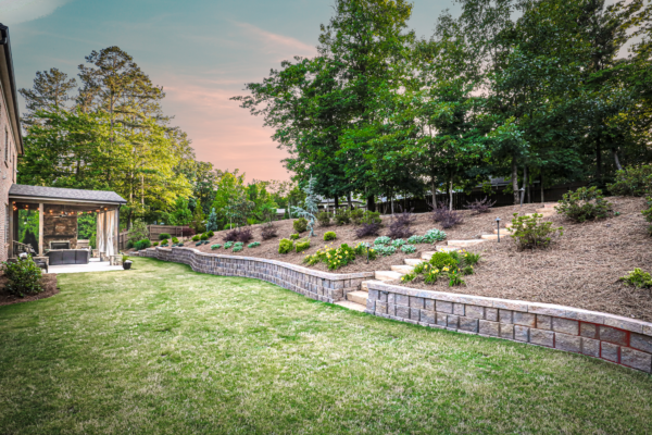 - Retaining walls and raised planters to define spaces.